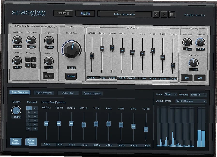 Assign each track as an independent object. Position it in 3D space. Let Spacelab calculate reverb, early reflections, and binaural output based on its coordinates.